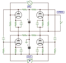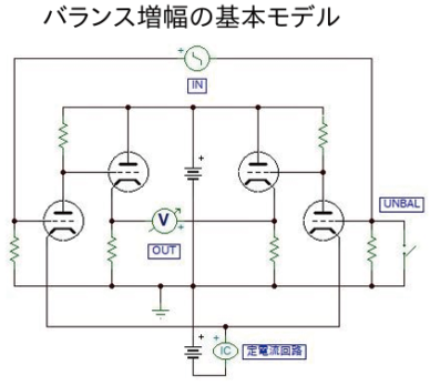 当社は、バランス増幅およびバランス入出力を採用しています。下図の回路図は、その基本モデルです。