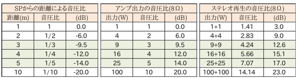 スピーカーから聴取位置までの距離が大きくなると、音圧は反比例して減衰するので、その分をアンプの出力で補うことになります。一般的には3m~5mと考えられるので、アンプの出力は8Ωの負荷に対して、9W+9W~25W+25Wが必要となります。
