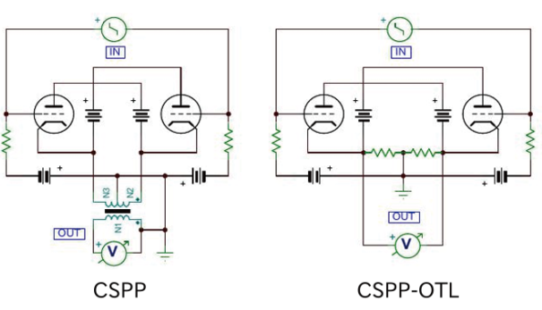 当社のほとんどのパワーアンプは、カソード出力のCSPP回路を採用しています。それは、出力トランスでの磁気合成を回避し、出力トランスを単純な出力信号のインピーダンス変換器として使用することを目的としています。