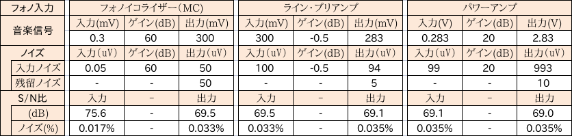 ポイントは、ターンテーブルとの接続にあります。下表では、50nVを見込んでいます。当社が推奨するターンテーブルとのバランス伝送は、この部分のノイズ低減に極めて有効です。