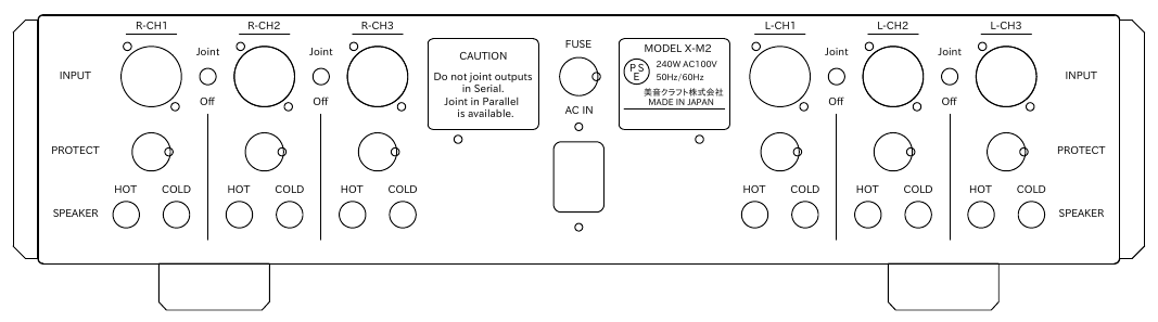 • 各チャネルは4Ω負荷が可能(8Ωユニット並列も可能)